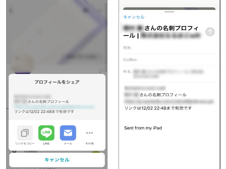 そこから、LINE・メール・Facebookなどを使って共有することができます。名刺データを共有する際に使用するURLは、有効期間が定められているのでセキュリティー的にも安心ですね。