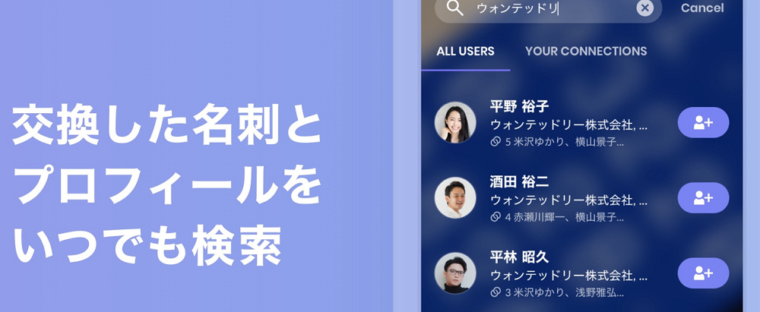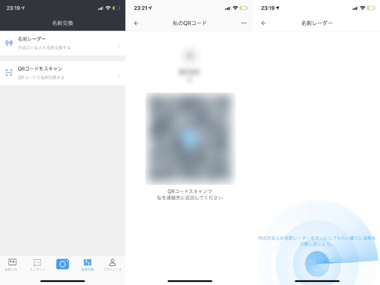 名刺レーダー機能やQRコードを使って名刺データを交換することができます。近くにいる場合は名刺データの交換がしやすいので便利ですよ。