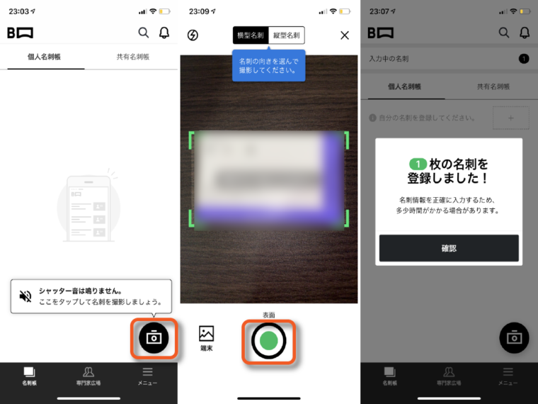 myBridgeなら、名刺情報を正確にデータ化することができます。アプリを起動し、カメラボタンから名刺を撮影するだけです。