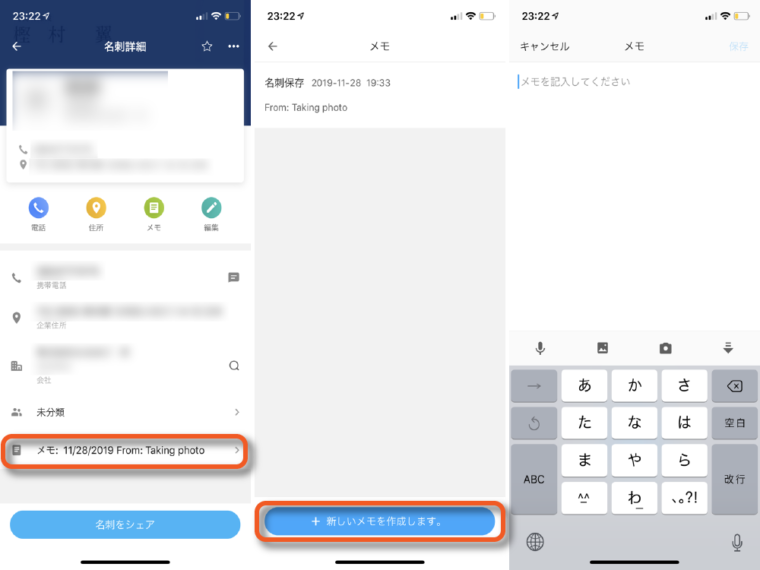 保存した名刺情報を開いて、メモ欄から「+新しいメモを作成します」をタップすると「メモ」か「訪問手帳」を選択できます。
