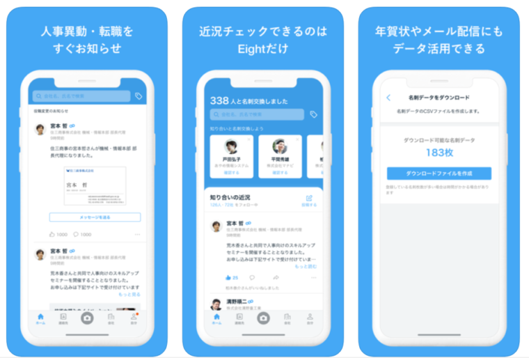 名刺交換した相手の近況状況を知ることができます。名刺交換した相手が転職や昇進された場合、Eightでつながっていると名刺を変更した場合に「通知」が届くようになっています。