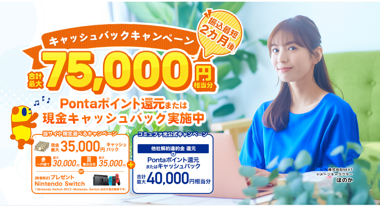 「NEXT」から新規契約すると、適用条件を満たした人へ最大6,000円分をキャッシュバック又はPontaポイントで還元(又は3,000円の還元+コミュファ光 4K-LINKプレゼント)されます。