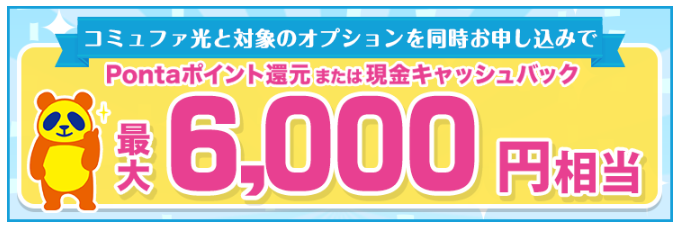 | ・コミュファ光メッシュWi-Fi | Pontaポイント還元+3,000円相当分 または、 現金キャッシュバック+3,000円 |