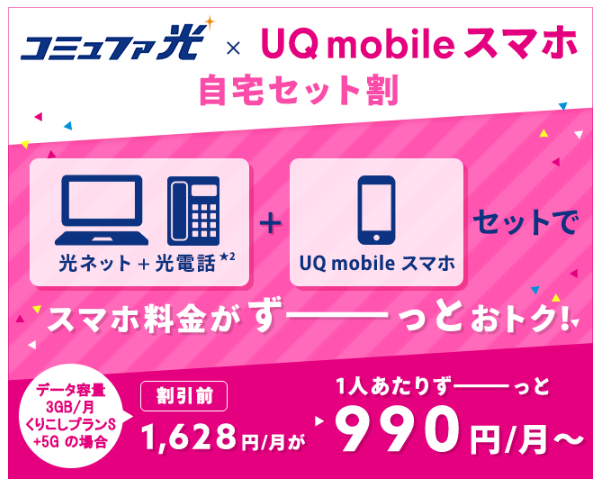 - UQモバイルセットで月額最大858円割引