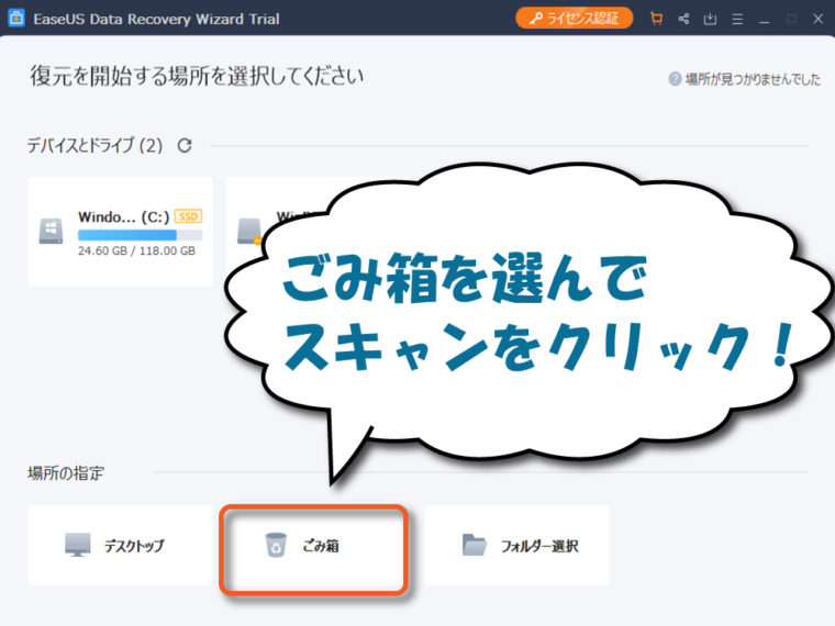 ステップ1、復元を開始する場所(ゴミ箱)を選んで「スキャン」をクリックする!