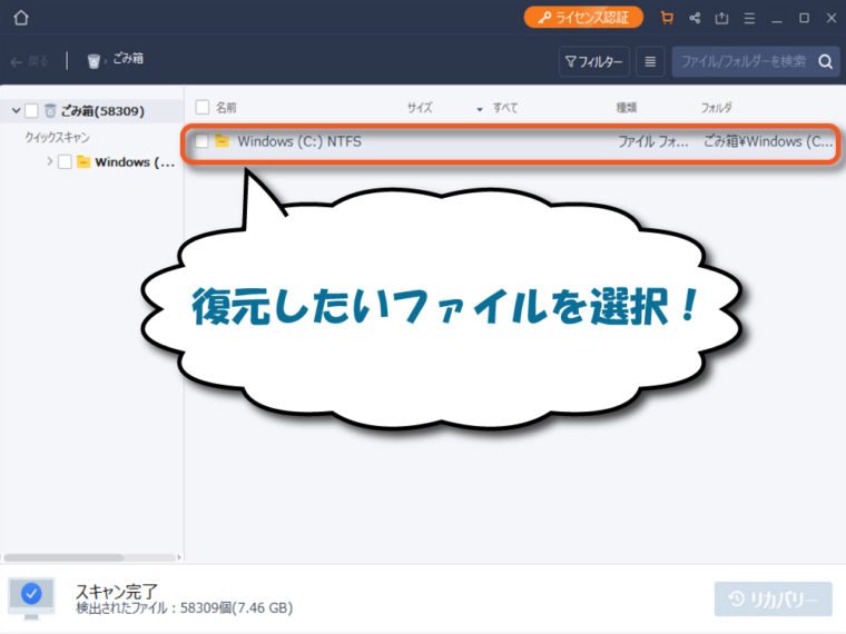 スキャン完了後ファイルを選択すると、チェックがついて右下の「リカバリー」ボタンがクリックできるようになります。