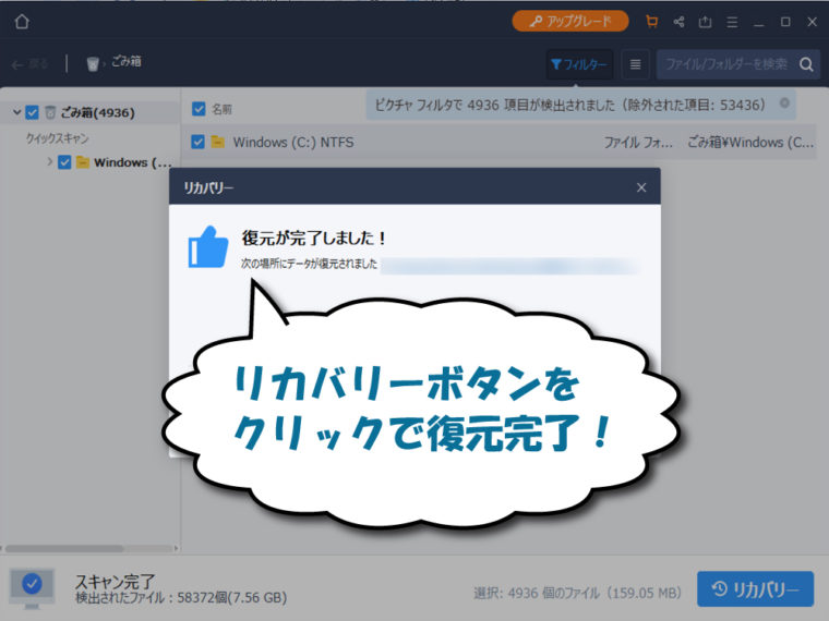 あとは「リカバリー」ボタンをクリックし、保存先を選択すれば完了です。