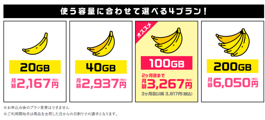 次に、料金プランを決めましょう!おすすめは、月額3,267円の100GBプランです。20GBプランと比較して月額700円しか違いません。無制限プラン以外の選択肢はないでしょう。
