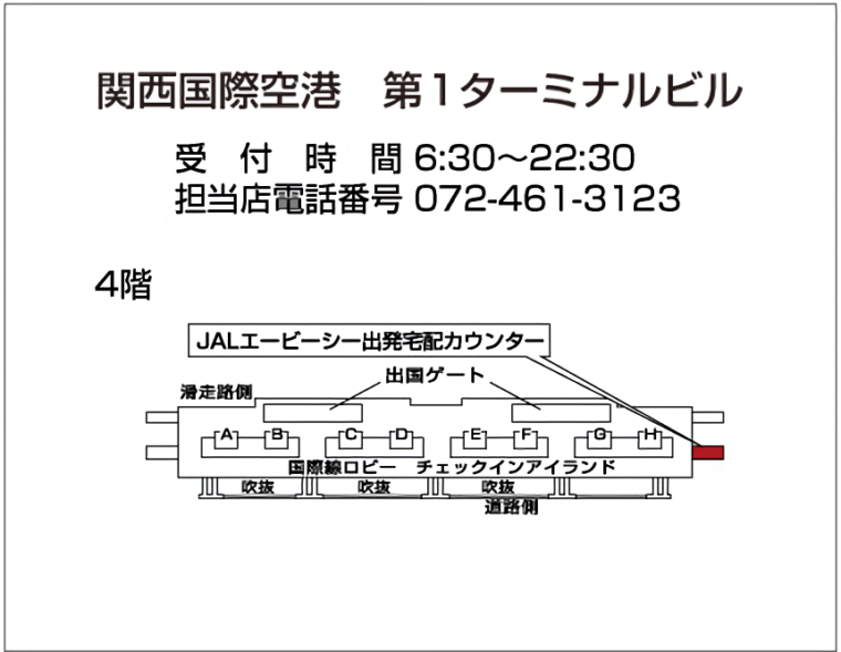 関空でジャパエモの端末を受け取る場合、第一ターミナルビル4FにあるJAL ABC出発宅配カウンターで受け取ることができます。