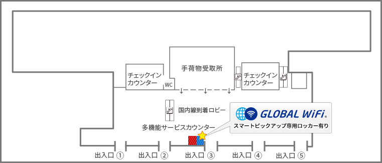上の画像はグローバルWi-Fiの鹿児島空港での受け取り・返却場所のマップになります。