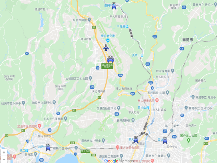 最寄りの加治木駅まで電車で30分前後、そこからバスで約20分ほど乗って鹿児島空港まで行く必要があります。乗り換えもあり、不便なのでバスを利用するのがおすすめです。
