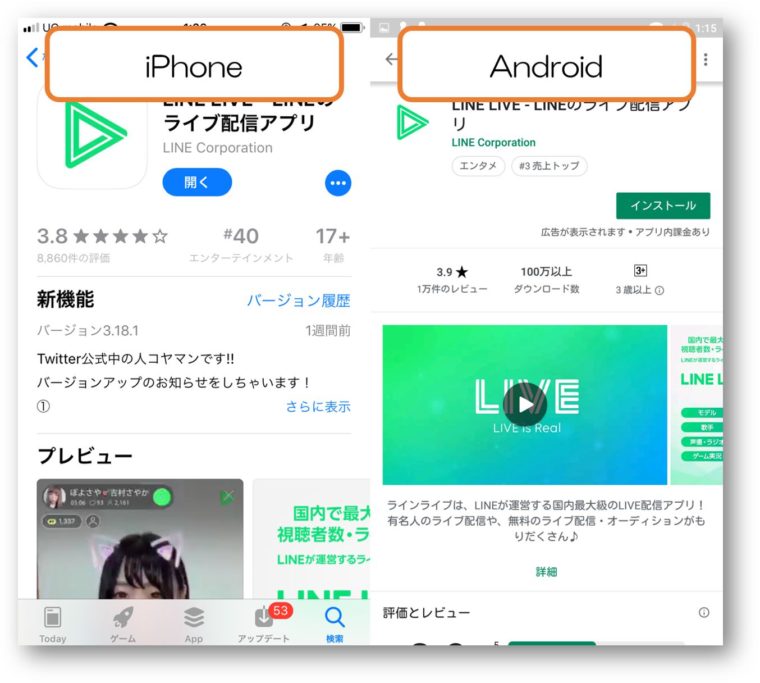 まずはLINE LIVEのアプリをダウンロードします。レビュー数、ダウンロード数ともに凄い数ですね!配信アプリは利用者が多いほど盛り上がって楽しいので、その点も安心です。