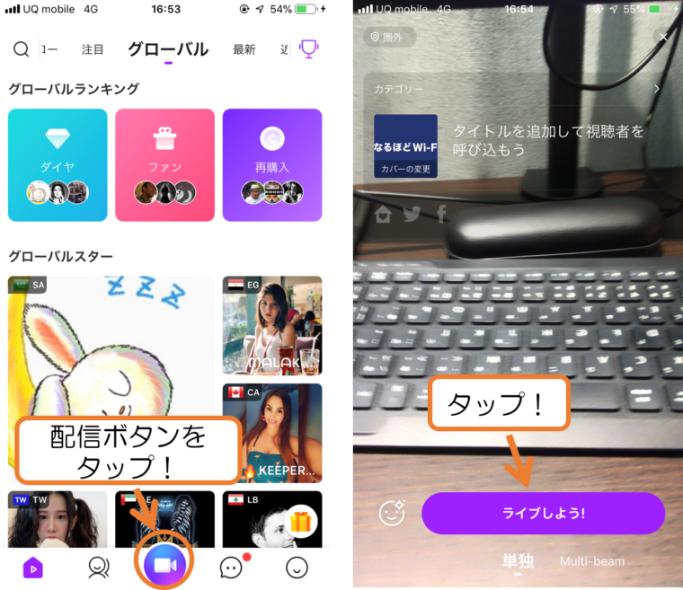 続いて、LiveMeの配信方法も解説していきます!アプリを使った配信は非常に簡単なので、ぜひチャンレンジしてみてください。