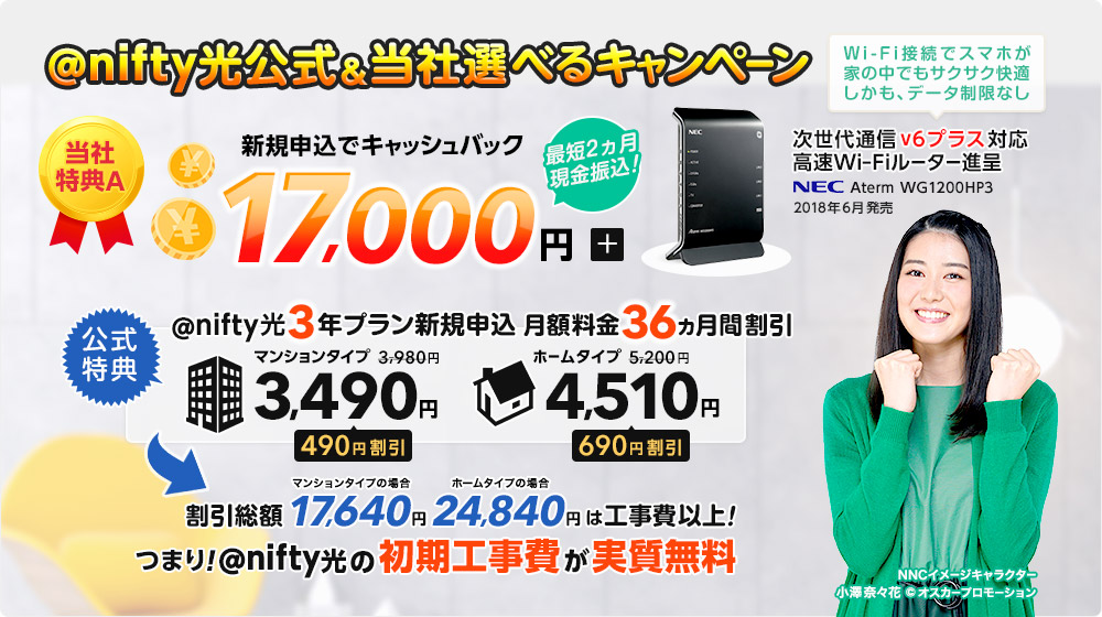 | 3 | @nifty光 | 25,000円または17,000円&WiFiルーター |