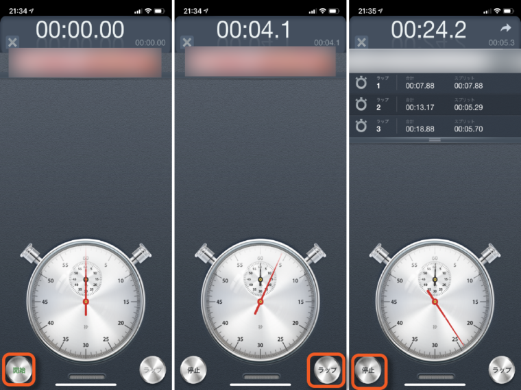 操作方法は「開始」ボタンまたは、ストップウォッチの左側のボタンをタップすれば計測が開始され、「ラップ」ボタンでラップ・スプリットの計測が可能です。