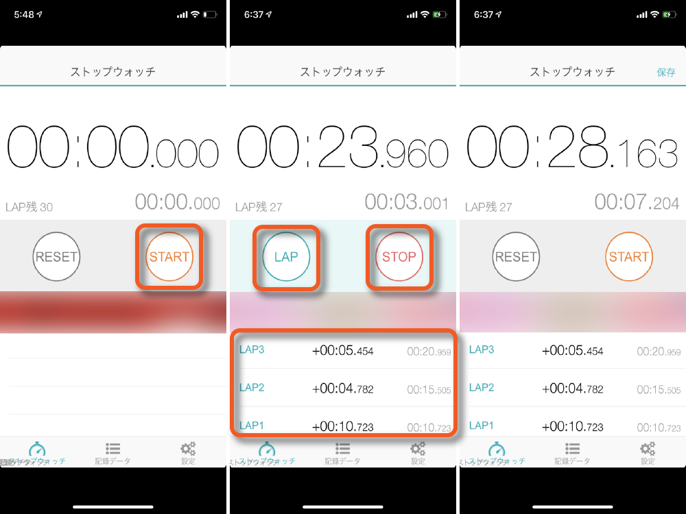 使い方は簡単で「START」ボタンを押すだけでOKです。止めたいときは「STOP」ボタンを押します。「LAP」ボタンを押すとラップタイムを記録してくれます。