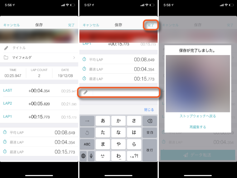 計測したタイムを保存することができます。その際、メモも入力できるから後で見直すときにわかりやすいのがいいですね。フォルダ単位で管理することができるので、たくさんのデータを計測する際もとても便利ですよ。