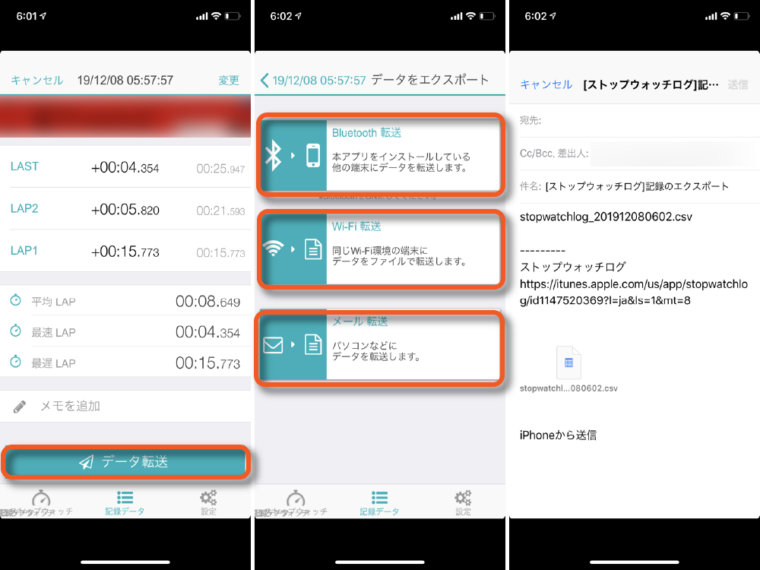 ストップウォッチログは、保存したデータを他の端末に簡単に転送することができます。データ単体だけでなくフォルダごとでも転送できるので、非常に管理がしやすくなっています。