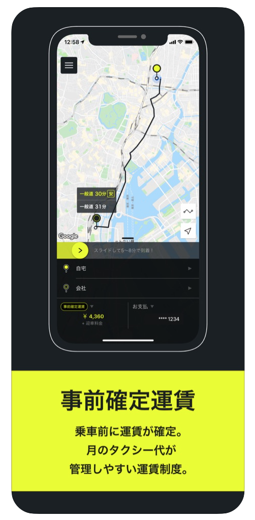 S.RIDEは、タクシー配車時に運賃を確定することができるので、タクシーの運賃に悩まされることがありません。同じ距離であれば、いつでも定額でタクシーに乗れるのは便利ですよね!