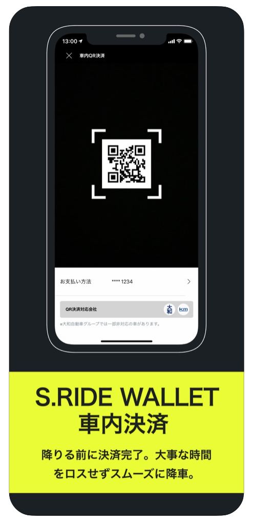 S.RIDEは、タクシーを降りる前に決済ができる「S.RIDE WALLWT車内決済」が可能です。