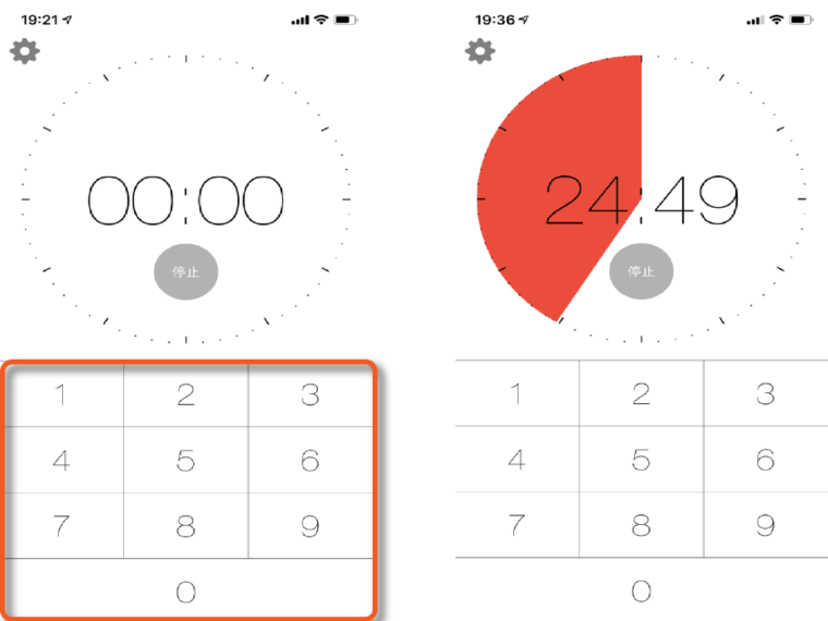 設定時間は1分単位で設定することができ、25分なら「2」→「5」と最大2タップでカウントダウンが開始されます。圧倒的に早いこの操作性が魅力です。