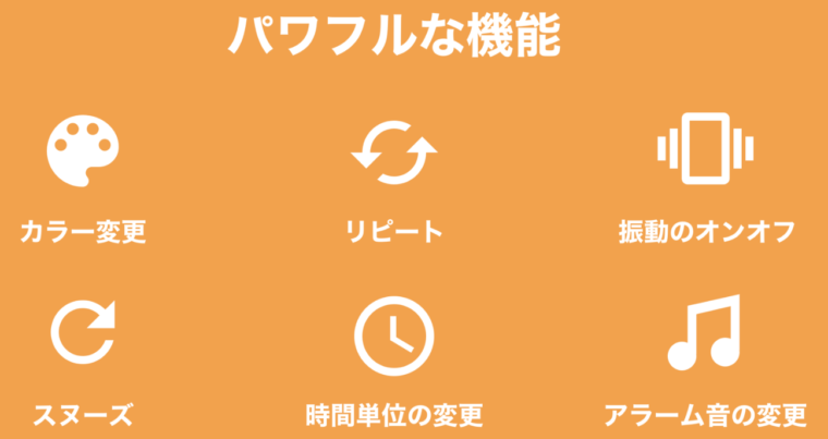 あっという間にタイマーが開始できるのはもちろん、テーマカラー、アラーム音、時間単位の変更・リピート・スヌーズ・振動のオンオフ・バックグラウンドなどにも対応しています。