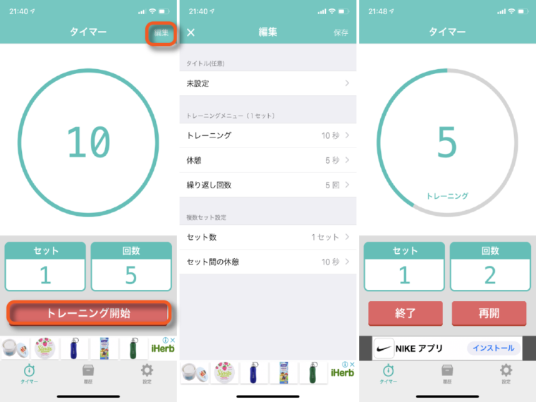 筋トレタイマーはシンプルで使いやすいのでトレーニングにもってこいのアプリです。画面握上の編集から、トレーニング・休憩・繰り返し回数・セット数・セット間の休憩の秒数を設定することができます。
