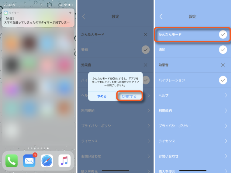 ただし、「かんたんモード」にしてしまうと、本来このアプリの持つスマホ使用を抑止する機能性は失われるので注意しましょう。