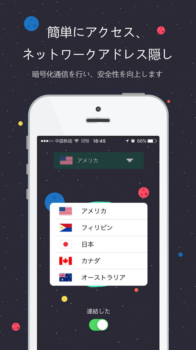 画面タップで、サイバー攻撃から守れる。というコンセプトのHotspotShield VPN。接続先は70ヵ国以上、VPN範囲は3200超えで、ブラウザ中のネット接続からプライバシーを保護します。