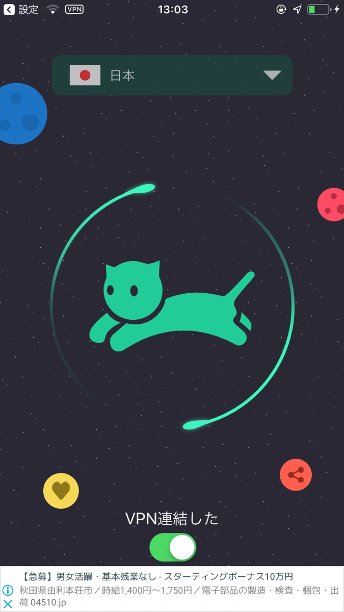 ワンタップでVPNの利用ができためインターフェース(使い勝手)はとてもよいです!