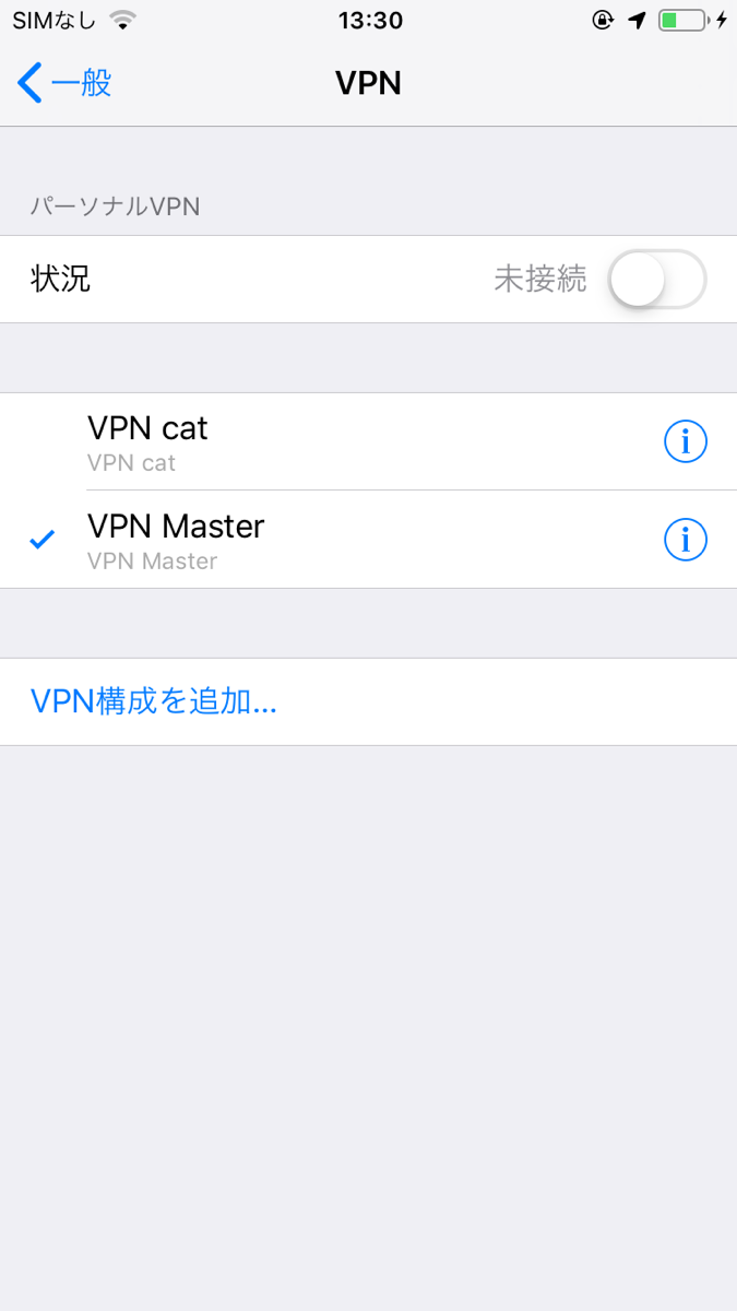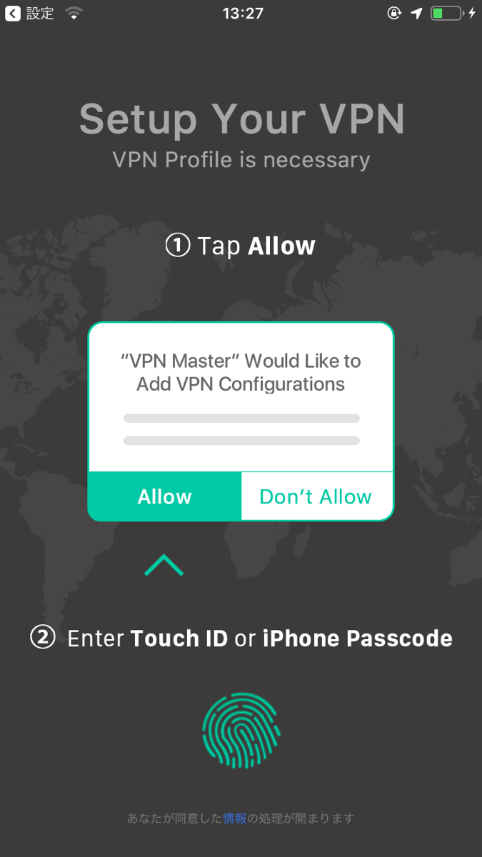 VPN Masterを実施VPN接続した画像ですが、「Allowボタン」→「指紋や顔認証」をすることで接続が完了します。